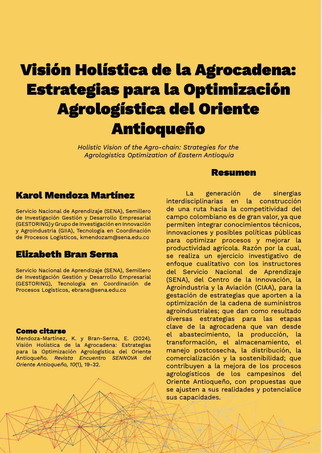 La generación de sinergias interdisciplinarias en la construcción de una ruta hacia la competitividad del campo colombiano es de gran valor, ya que permiten integrar conocimientos técnicos, innovaciones y posibles políticas públicas para optimizar procesos y mejorar la productividad agrícola. Razón por la cual, se realiza un ejercicio investigativo de enfoque cualitativo con los instructores del Servicio Nacional de Aprendizaje (SENA), del Centro de la Innovación, la Agroindustria y la Aviación (CIAA), para la gestación de estrategias que aporten a la optimización de la cadena de suministros agroindustriales; que dan como resultado diversas estrategias para las etapas clave de la agrocadena que van desde el abastecimiento, la producción, la transformación, el almacenamiento, el manejo postcosecha, la distribución, la comercialización y la sostenibilidad; que contribuyen a la mejora de los procesos agrologísticos de los campesinos del Oriente Antioqueño, con propuestas que se ajusten a sus realidades y potencialice sus capacidades.