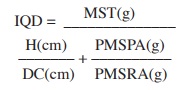 Where: IQD = Dickson development index, MST = Total dry mass (g), H = height (cm), DC = stem diameter (cm), PMSPA = weight of shoot dry weight (g) and PMSRA = weight of shoot dry weight (g).