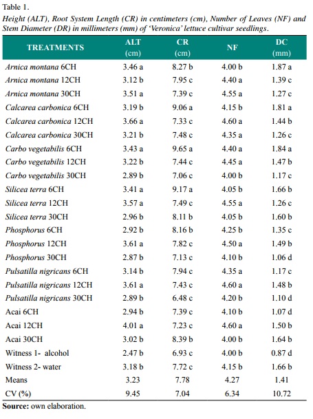 Thus, we sought to evaluate in this study the influence of different potencies of homeopathic medicines Arnica Arnica montana, Calcarea carbonica, Carbo vegetabilis, Silicea terra, Phosphorus, Pulsatilla nigricans and homeopathic preparation of Acai waste in the development of lettuce cultivar ‘Veronica’ seedlings.