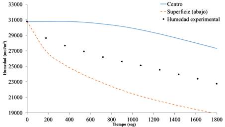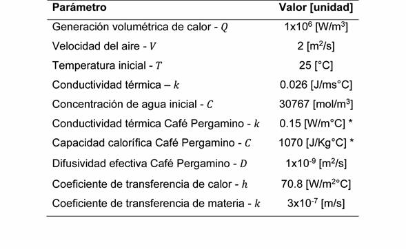 En este trabajo se resolvió numéricamente el secado de Café Pergamino (género coffea, especie arábica, variedad castillo) a través de la resolución de los balances microscópicos de energía y materia. En el modelado fueron consideradas condiciones convectivas que tienen en cuenta el efecto del flujo de aire en la geometría 3D del grano de café. Para la transferencia de energía, se utilizó la ley de Fourier y para la transferencia de materia la ley de Fick, ambas en estado no estacionario. Con el propósito de incorporar el efecto de las microondas sobre los granos de café, se incorporó una fuente de calor constante. La validación fue realizada obteniendo buena concordancia entre los datos experimentales y las simulaciones.