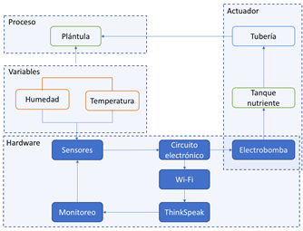 El aumento de población en el mundo afecta diferentes áreas como la seguridad, la vivienda, ocupación de territorio, manejo de basuras, seguridad alimentaria entre otros por lo que se hace necesario modificar las dinamicas de comportamiento en las ciudades por lo que el problema se puede observar desde dos puntos de vista, el primero corresponde a la unión de la seguridad alimentaria y los espacios urbanos reducidos y el segundo desde la implementación e integración tecnológica, el objetivo de esta investigación fue la construcción de un prototipo funcional capaz de monitorear y controlar el sistema de riego de un cultivo por NFT (Nutrient Film Technic) enfocandose el prototipo en el contexto de casas de interés social obteniendo resultados de las variables de temperatura y humedad relativa las cuales se monitorearon desde una plataforma web abierta.