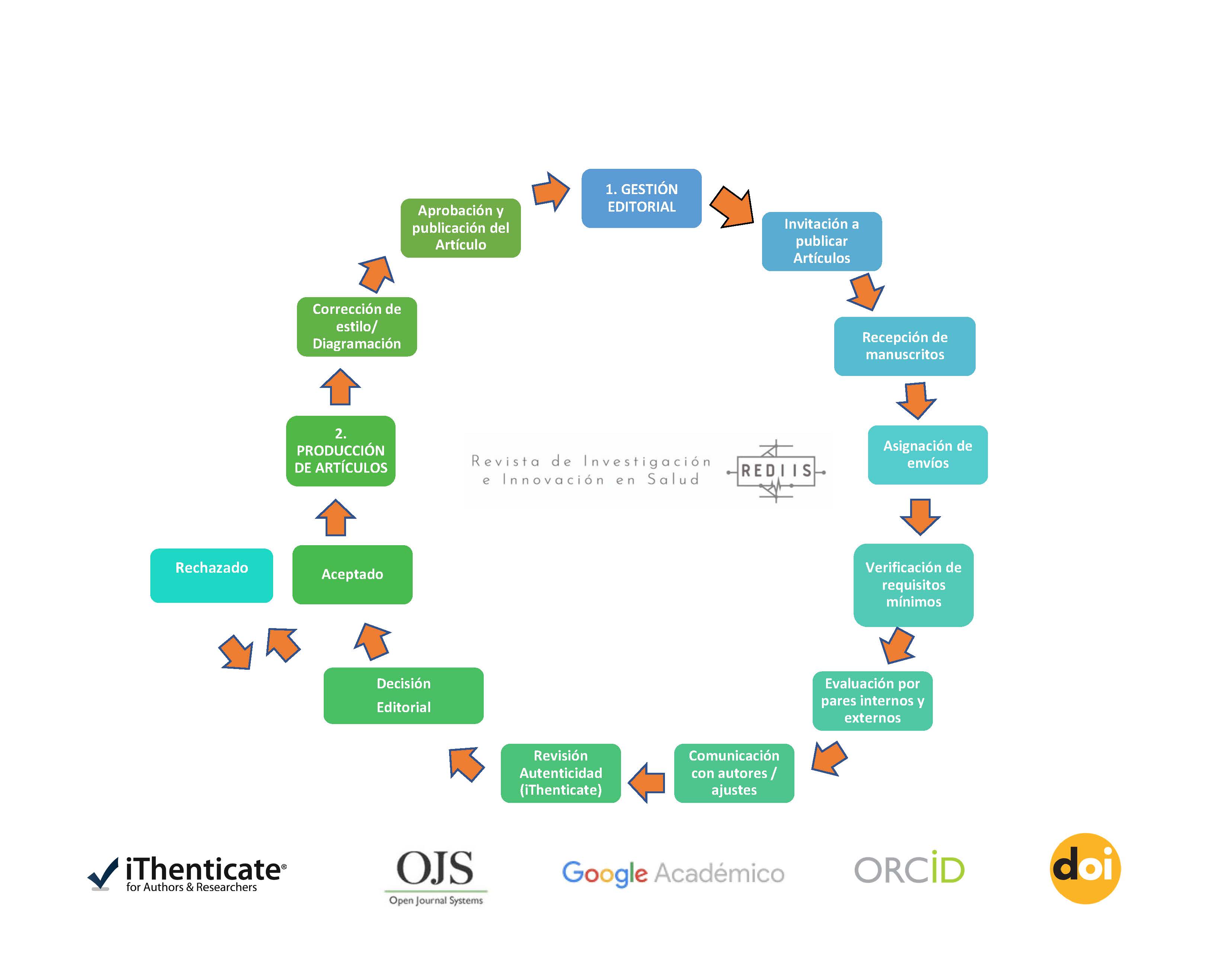 En la siguiente figura se presentan las fases de la gestión editorial, que abarcan la gestión de manuscritos y la producción de artículos.